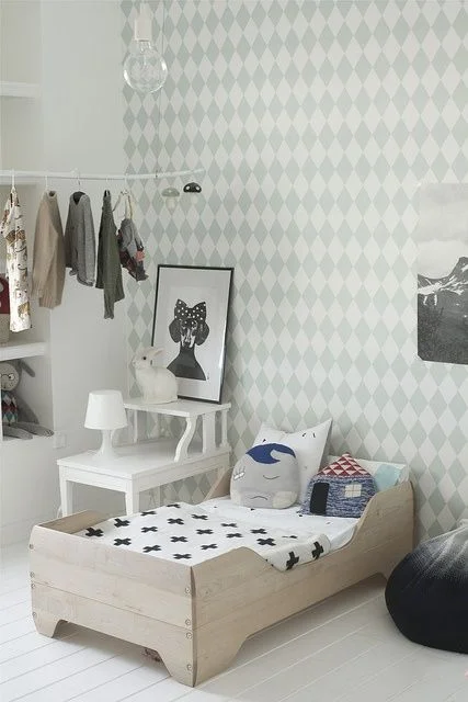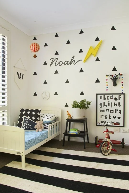 Wall decals, a graphic rug, and a perfectly sized toddler bed from Apartment Therapy. Adorbs!