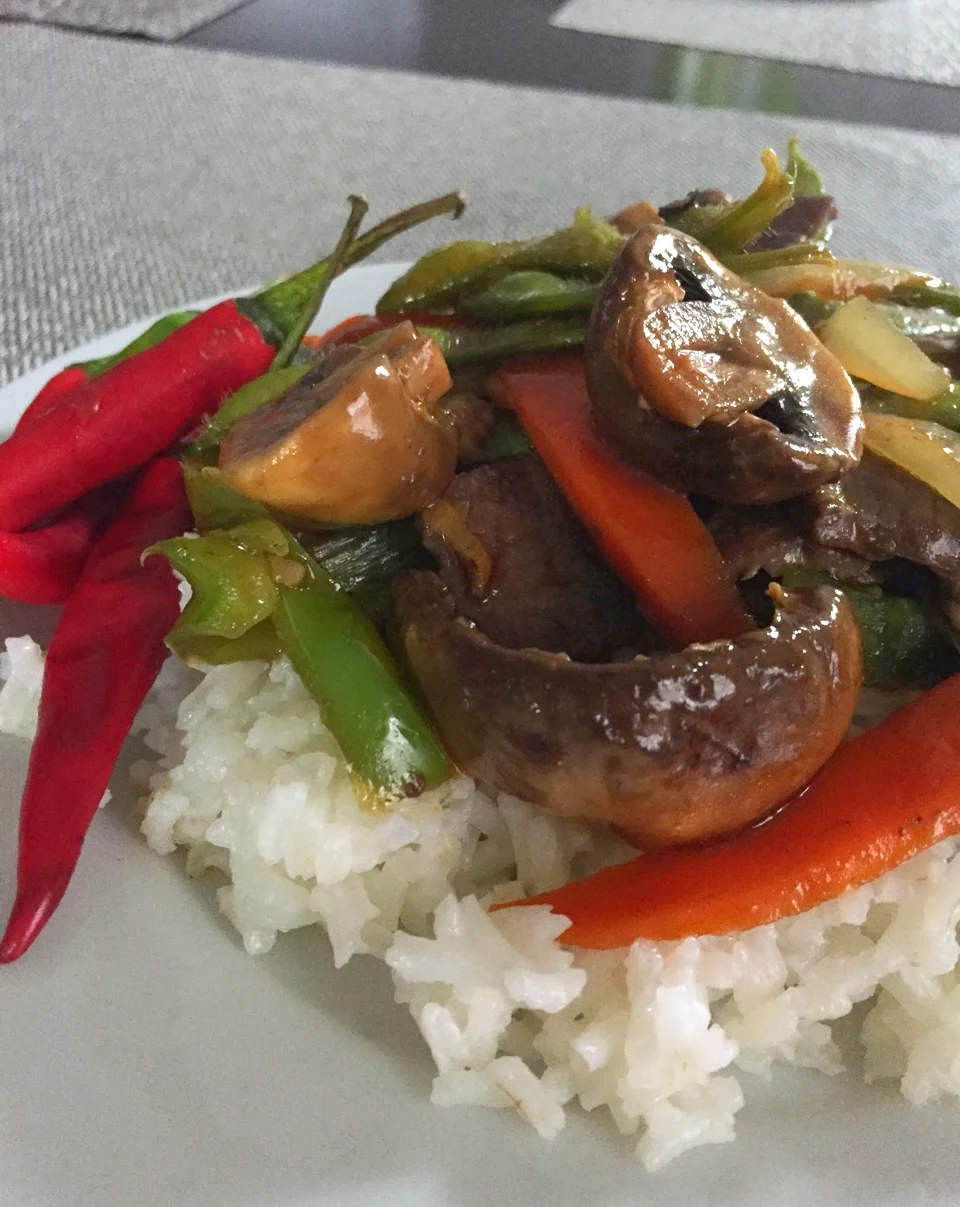 Slice your steak in about a two-inch width. Throw it in the pan with the veggies, which should be just about finished cooking. We’re almost done! Pour the sauce over your veggies and give everything a good stir to make sure everything gets coated. Give it about two minutes in the pan, and you’re done! Serve over fluffy white rice.