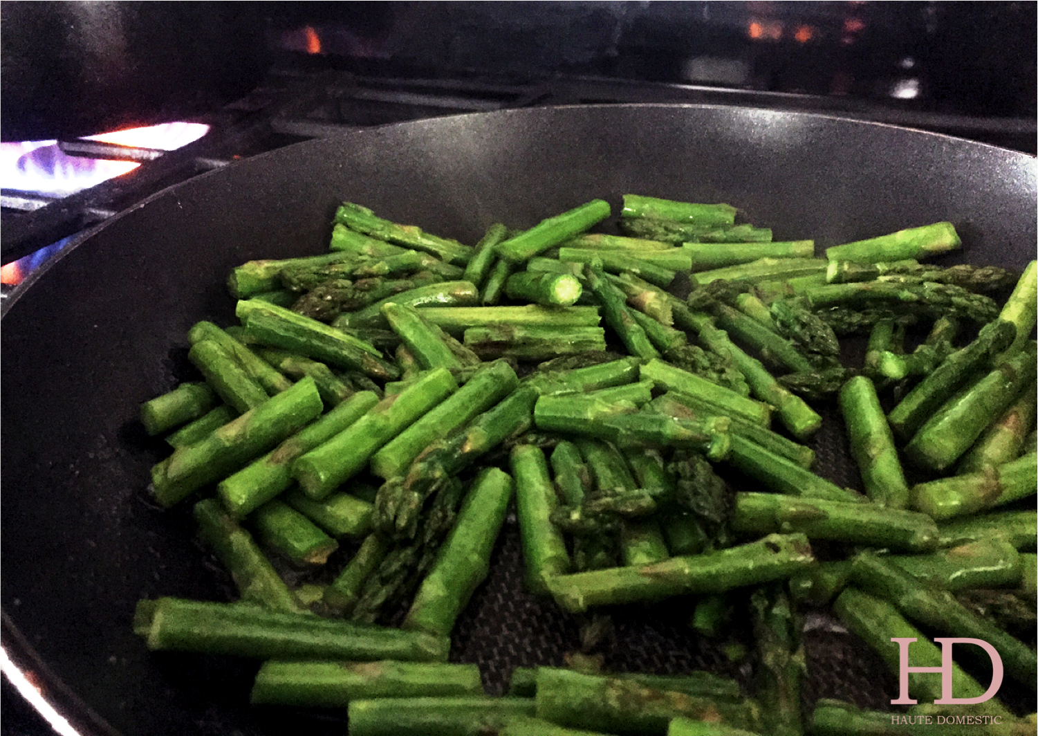 While you’re waiting for the pot to come to a boil, prepare your vegetables. Clean, trim, and chop your asparagus into about inch long pieces. Take special care to remove the tough stalks of the asparagus, or roughly the bottom two inches of the vegetable. Throw the chopped asparagus into a deep skillet with about a tablespoon of olive oil. You can salt and pepper them in the pan as they cook over medium heat. Seasoning in the pan always makes me feel like a real chef, so I imagine it will do the same for you.