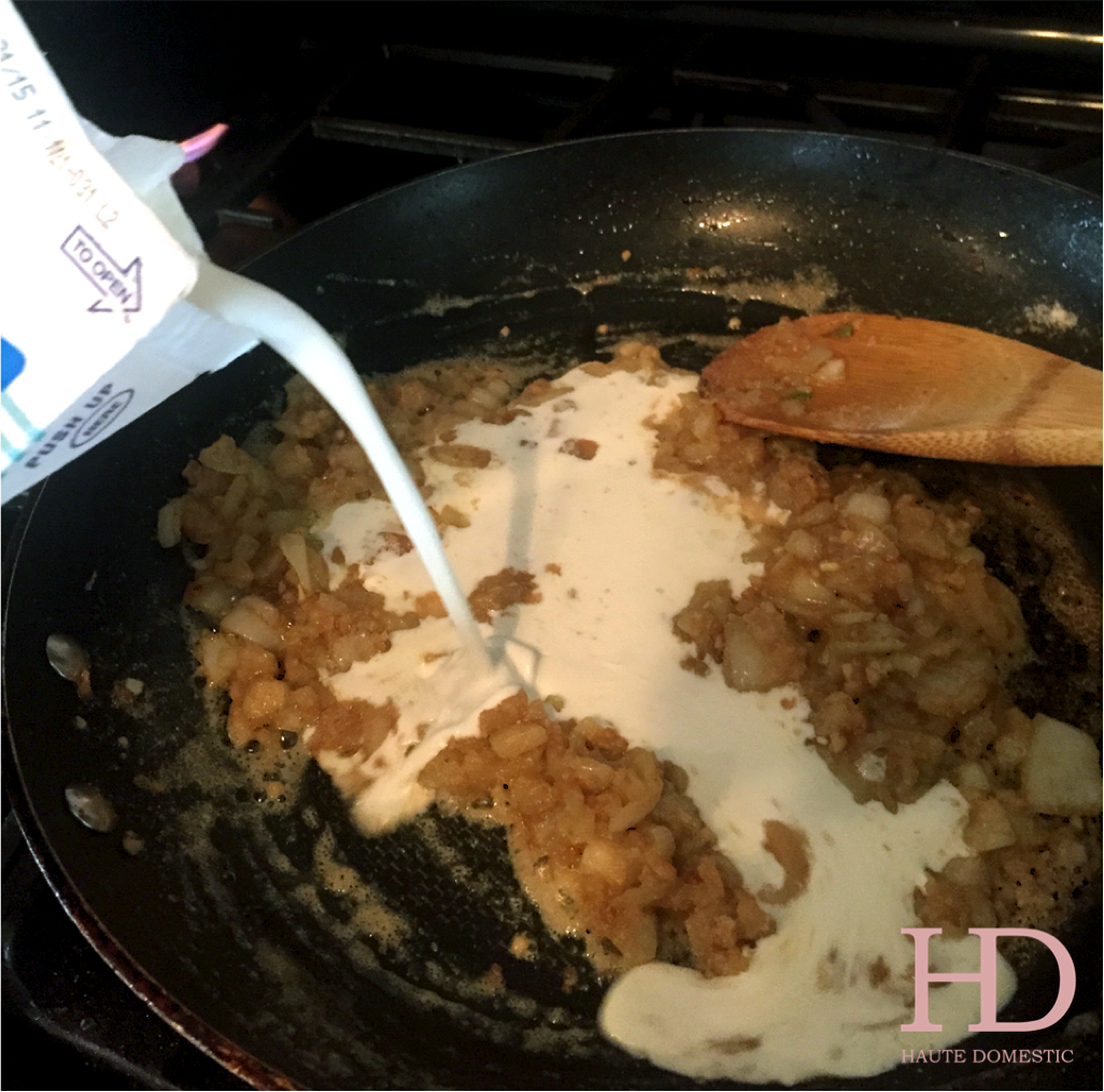 Toss your diced onion into the same pan once the asparagus have been removed. Let them cook down until softened. Your pasta water should’ve come to a boil by now, so go ahead and dump your pasta in, and add another tablespoon of olive oil to the water, to keep the pasta from sticking. From here I employ my standard alfredo sauce recipe, but leave the onions in the pan for good measure. They flavor the sauce nicely.