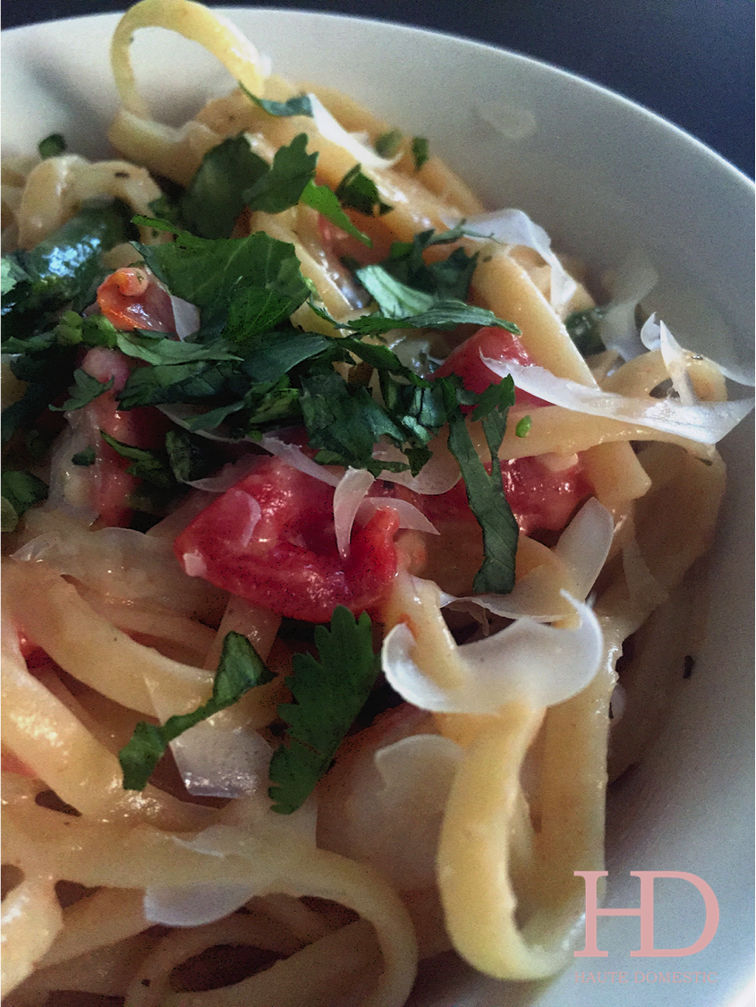 Add your drained tomatoes to the skillet, right into the simmering sauce, followed by your shrimp (which you can lightly season with salt and pepper before adding). Let the shrimp go for about three minutes, then add the asparagus. Give it another three or so minutes then add your pasta, right into the skillet (another surefire way to feel like a real chef). Toss the pasta around with the sauce, getting everything well combined. Let the entire skillet go for about another five minutes. Voila! Serve in big bowls with a sprinkling of flat leaf parsley and a little shaved parmesan.