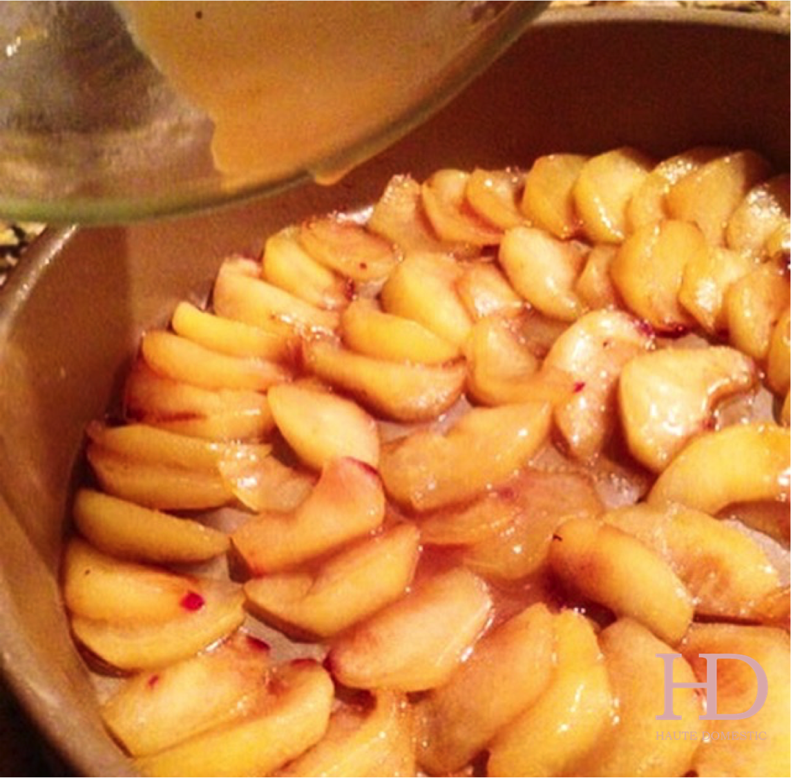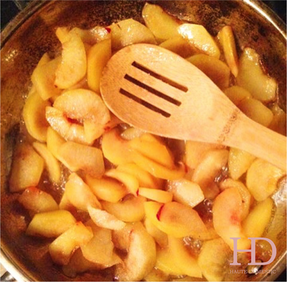 Melt a tablespoon of butter in a sauté pan over medium high heat. Once the butter is all melted, add the wedges of plum and a quarter cup of sugar and let them work together in the pan until the wedges become syrupy, or for about five minutes. Pour the plums and butter and syrupy deliciousness onto a platter to cool a little bit.