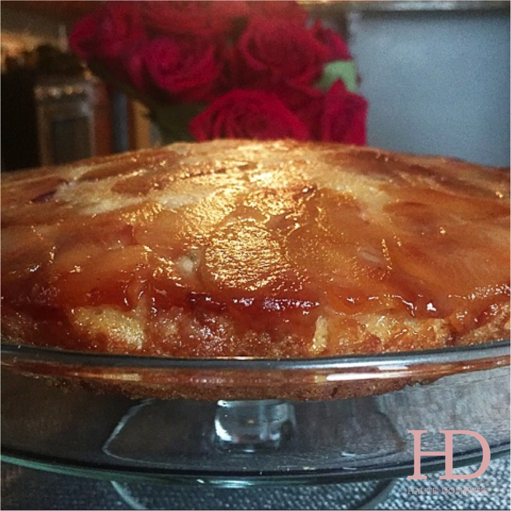 Pour the batter over the plums, and spread gently to the edges of the pan. Bake in your preheated oven for 45 – 50 minutes. Let the cake cool in the pan for at least thirty minutes, but no longer than an hour. Place a large plate over the cake pan and invert the cake onto the plate.